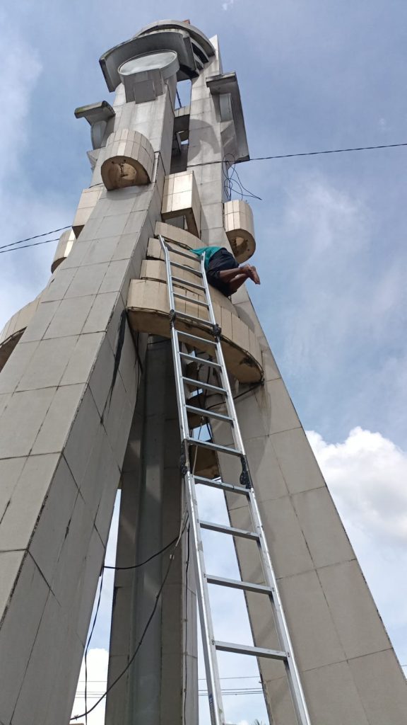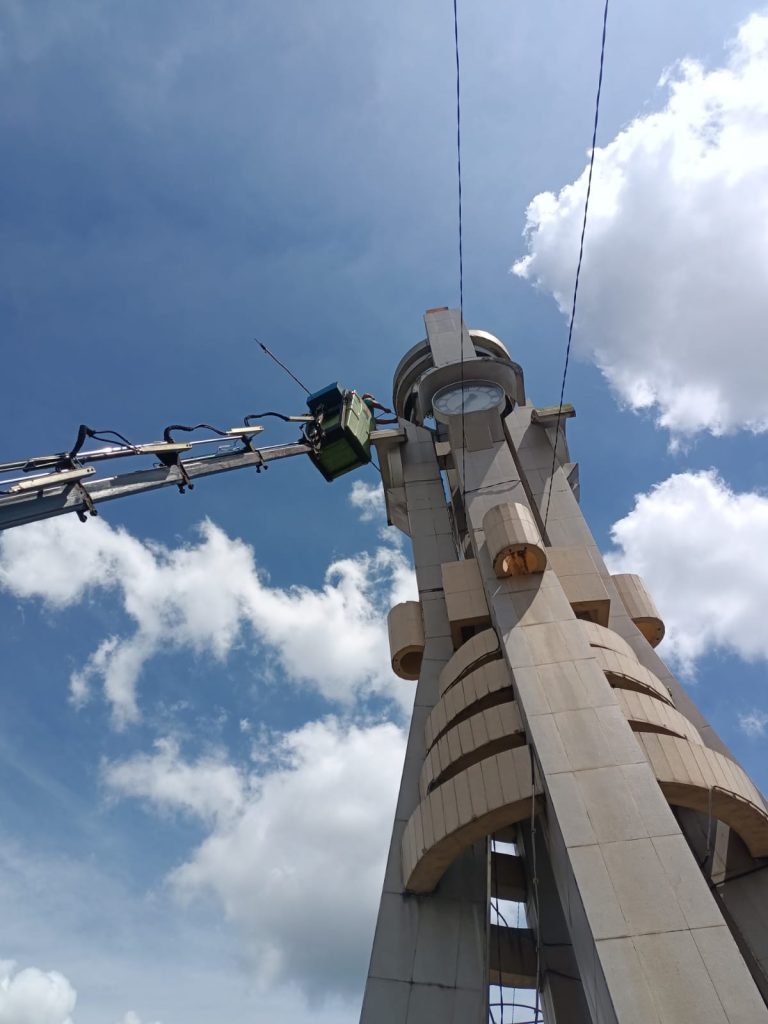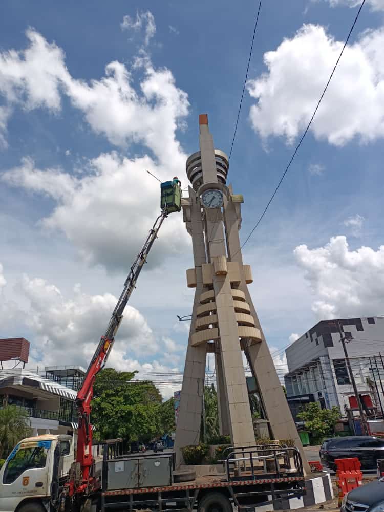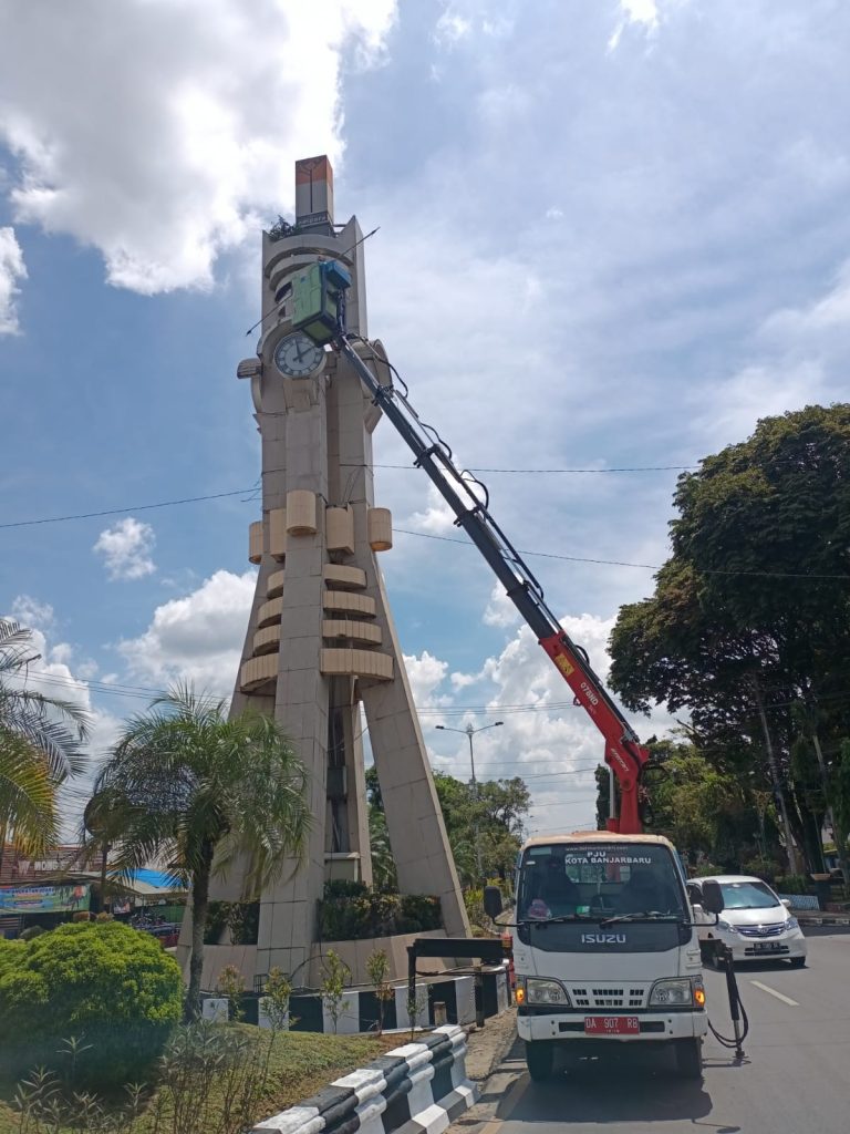Bidang Sarana dan Utilitas Dinas Perumahan dan Permukiman Kota Banjarbaru melakukan perbaikan jam pada tugu adipura sekaligus membersihkan gulma/ rumput liar. Tim PSU berangkat Rabu, 5/4/2023 dengan membawa satu buah alat transportasi crane ke lokasi di Jalan Ahmad Yani dekat dengan rumah Dinas Wali Kota Banjarbaru.