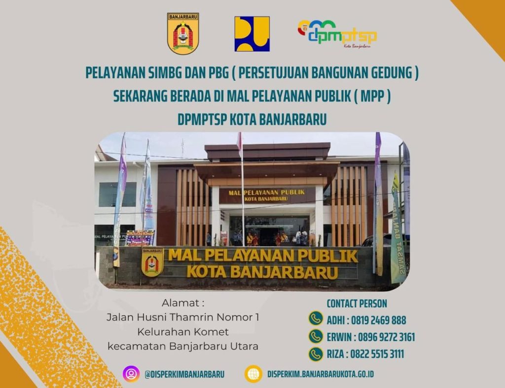 Terhitung mulai hari Kamis per tanggal 3 Oktober 2024, Dinas Perumahan dan Permukiman Kota Banjarbaru akan memindahkan pelayanan SIMBG dan PBG ke Mal Pelayanan Publik (MPP) Dinas Penanaman Modal dan Pelayanan Terpadu Satu Pintu (DPMPTSP) Kota Banjarbaru yang beralamat di Jl. Husni Thamrin No. 1, Kelurahan Komet, Kec. Banjarbaru Selatan.