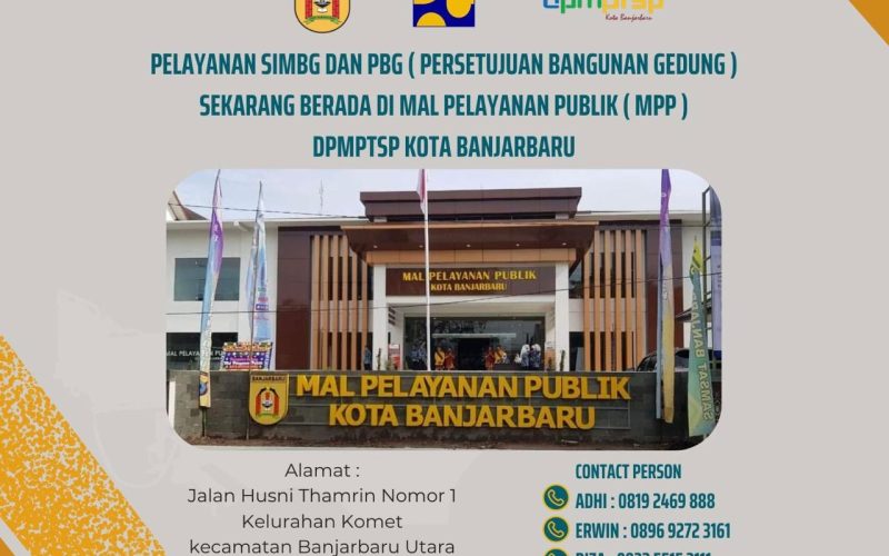 Terhitung mulai hari Kamis per tanggal 3 Oktober 2024, Dinas Perumahan dan Permukiman Kota Banjarbaru akan memindahkan pelayanan SIMBG dan PBG ke Mal Pelayanan Publik (MPP) Dinas Penanaman Modal dan Pelayanan Terpadu Satu Pintu (DPMPTSP) Kota Banjarbaru yang beralamat di Jl. Husni Thamrin No. 1, Kelurahan Komet, Kec. Banjarbaru Selatan.